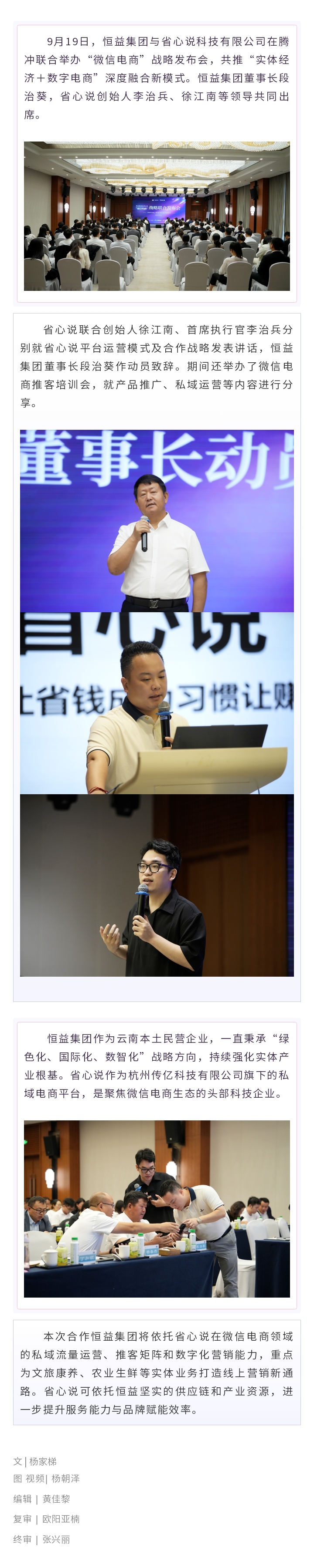 恒益集團(tuán)與省心說科技達(dá)成合作 共筑微信電商新生態(tài) 來源: 瀏覽量:224 日期:2025-09-19 分享到: 上一篇:榮登雙榜!恒益集團(tuán)榮獲2025云南民企百強(qiáng)第30位、服務(wù)業(yè)20強(qiáng)第8位 下一篇:喜訊丨恒益集團(tuán)榮膺2025年“騰沖市教育事業(yè)高質(zhì)量發(fā)展先進(jìn)集體”稱號(hào)